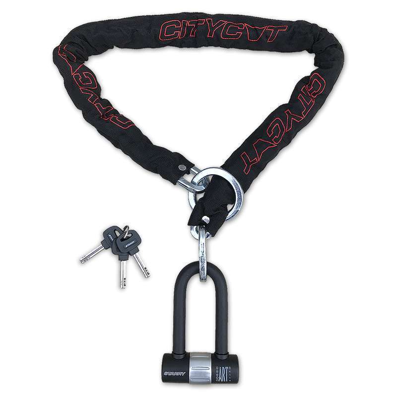 Dit ART 3 kettingslot met loop en extra lange schijfrem u-slot van Citycat biedt een goede bescherming tegen diefstal van bromfietsen, snorfietsen en scooters. De kettingschakels zijn gemaakt van 10 millimeter dik gehard staal, waar een zachte nylon hoes omheen zit ter bescherming van de lak. Één uiteinde van de ketting is voorzien van een loop, waardoor deze makkelijk om een vast object heen te halen is. Nog een pluspunt, met een simpele draaibeweging draai je een kap voor het sleutelgat, waardoor de cilinder mooi schoon blijft. Wordt geleverd met drie sleutels.