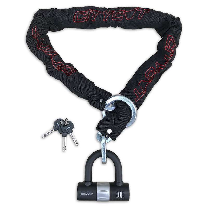 Dit ART 4 kettingslot met loop en mini u-slot van Citycat biedt een goede bescherming tegen diefstal van scooters en motorfietsen. De kettingschakels zijn gemaakt van 10.5 millimeter dik gehard staal, waar een zachte nylon hoes omheen zit ter bescherming van de lak. Één uiteinde van de ketting is voorzien van een loop, waardoor deze makkelijk om een vast object heen te halen is. Nog een pluspunt, met een simpele draaibeweging draai je een kap voor het sleutelgat, waardoor de cilinder mooi schoon blijft. Wordt geleverd met drie sleutels.