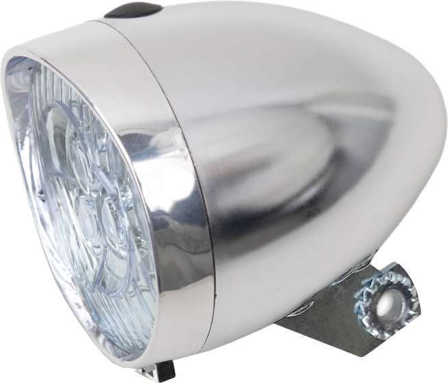 De populairste Lynx koplamp van dit moment: de oma-koplamp. In chroom uitvoering. Deze basic retro verlichting is voorzien van 3 heldere LED’s voor beter zicht, en verbeterde zichtbaarheid. Geleverd in bulkverpakking. De koplamp werkt op de standaard meegeleverd AAA batterijen. Kenmerken: 3 heldere LED’s Inclusief 3 AAA batterijen Specificaties: Kleur: chroom Materiaal: kunststof Diameter glas: 65 mm Type verlichting: led Gewicht: 140 gram Met schakelaar aan de bovenzijde. Wordt geleverd zonder bevestigingsmateriaal. Inhoud: 1 Koplamp 3 Batterijen (AAA)