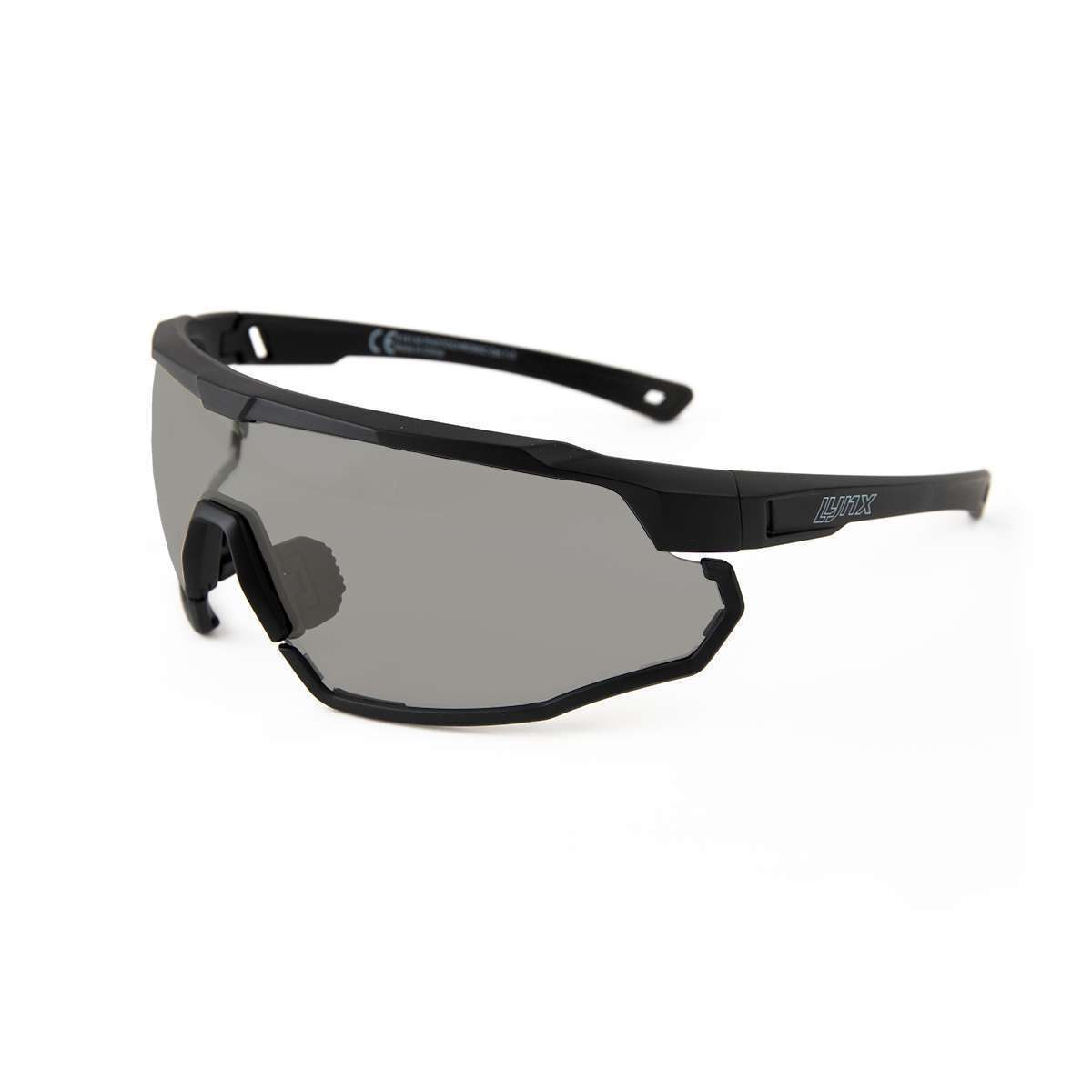 De Lynx Galibier-P fietsbril, voorzien van fotochromatische lens, is de meest ‘slimme’ bril van de Lynx sportzonnebrillen lijn. De lens van deze zonnebril past zich namelijk automatisch aan, aan de weersomstandigheden. Bij felle zon wordt de lens donkerder, maar wanneer de zon achter de wolken verdwijnt zal de lens weer lichter kleuren. Door deze lens eigenschappen is de Galibier-P te gebruiken voor ieder weertype en voldoet de bril aan de categorieën 1 tot en met 3 qua lichtdoorlatendheid. Daarbovenop bied de lens 100% bescherming tegen Uv-straling en zal deze niet beslaan. Om er voor te zorgen dat de bril perfect blijft zitten, zijn aan de binnenkant van de brillenpootjes anti-slip vlakken aangebracht, zijn de rubberen neusstukken verstelbaar én kun je de meegeleverde elastische band aan de uiteinde van de brillenpootjes klikken. Het frame van de Galibier-P fietsbril is gemaakt van TR90 thermoplast materiaal, dit kunststof maakt de bril ultralicht, zeer duurzaam en flexibel. De fietsbril wordt geleverd in een hard case brillendoos met brillendoekje. Goed om te weten, de zwarte strips aan de onderkant van de lens zijn er af te halen.