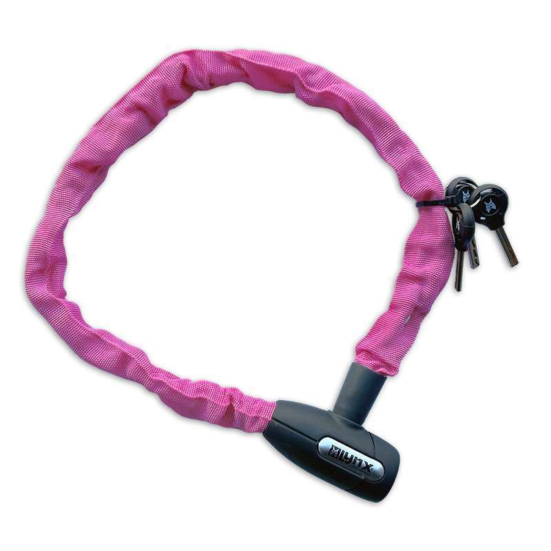 Het roze Lynx Cityline M kettingslot heeft een 85 cm lange hoogwaardig geharde stalen ketting met 5.5 mm dikke vierkante schakels. Dit veiligheidsslot is weerbestendig en voorzien van het auto-click sluitsysteem*. De kettingschakels zijn omhult met een zachte nylon hoes om beschadigingen aan de fiets te voorkomen. Dit kettingslot wordt standaard geleverd met 3 sleutels.