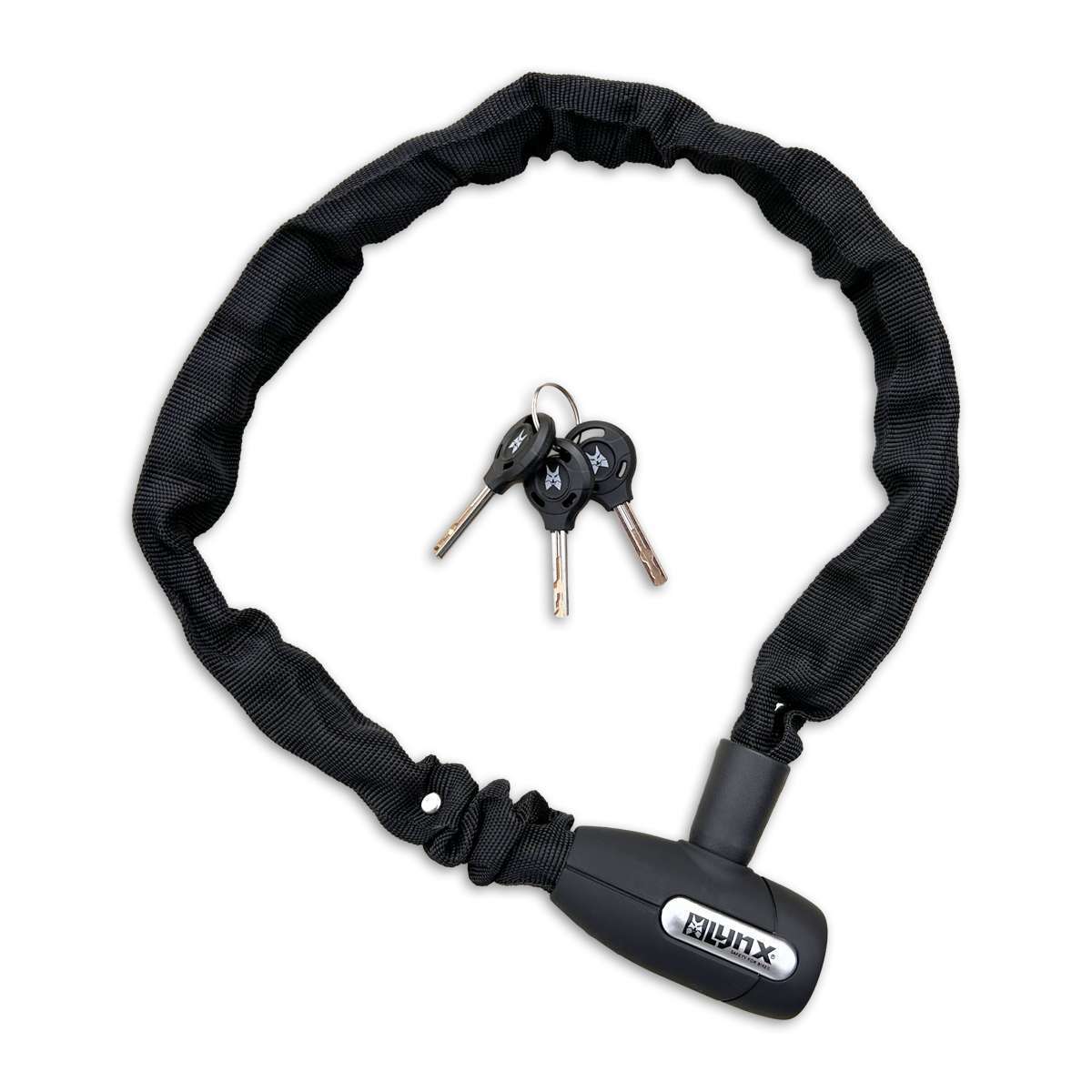 Het Lynx Cityline M kettingslot heeft een 85 cm lange hoogwaardig geharde stalen ketting met 5.5 mm dikke vierkante schakels. Dit zwarte veiligheidsslot is weerbestendig en voorzien van het auto-click sluitsysteem*. De kettingschakels zijn omhult met een zachte nylon hoes om beschadigingen aan de fiets te voorkomen. Dit kettingslot wordt standaard geleverd met 3 sleutels.