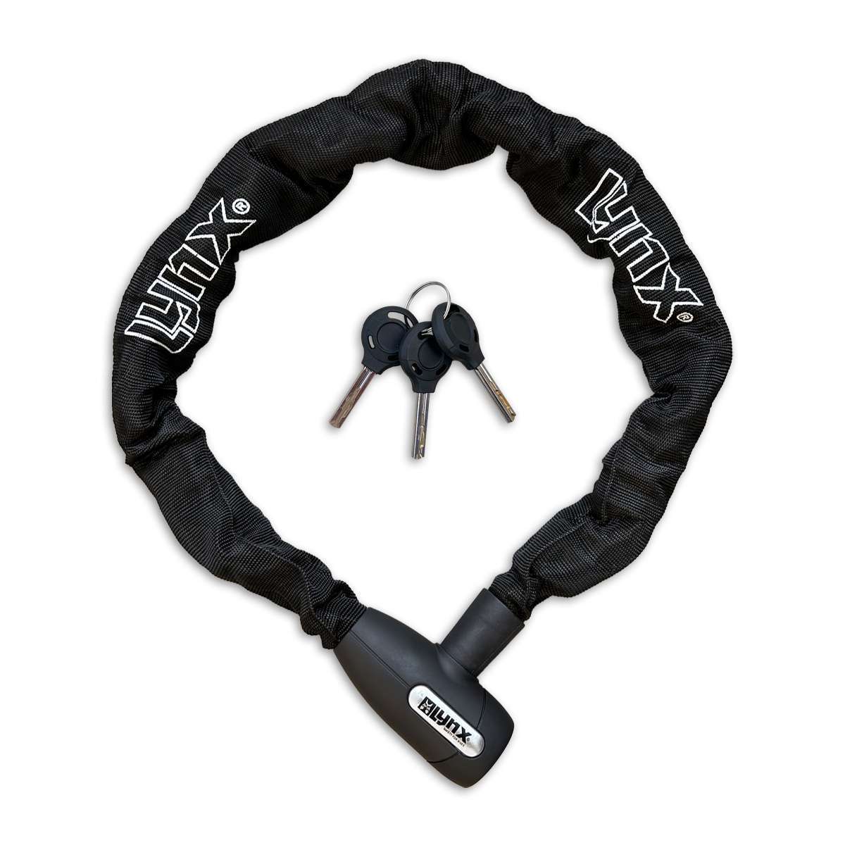 Het Lynx Cityline XL kettingslot heeft een 95 cm lange hoogwaardig geharde stalen ketting met 10 mm dikke vierkante schakels. Dit zwarte veiligheidsslot is weerbestendig en voorzien van het auto-click sluitsysteem*. De kettingschakels zijn omhult met een zachte nylon hoes om beschadigingen aan de fiets of bromfiets te voorkomen. Dit kettingslot wordt standaard geleverd met 3 sleutels.