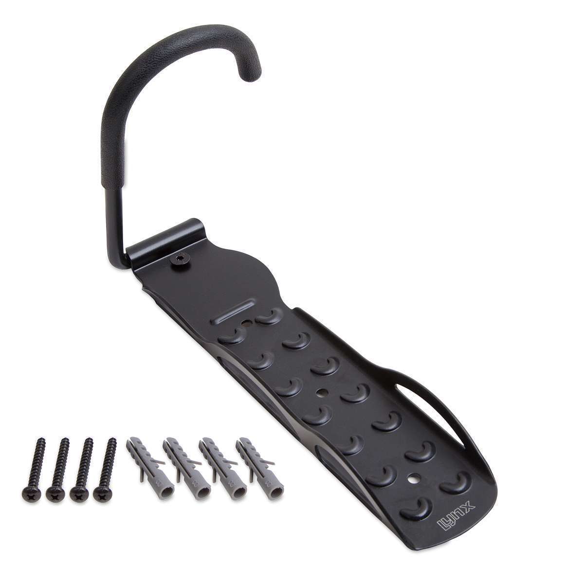 Met deze stabiele universele fiets wandhouder/muurbeugel van Lynx, hang je gemakkelijk vrijwel elk type fiets aan de muur/wand. De fiets wordt opgehangen aan de muurbeugel middels het voorwiel aan de haak te hangen, super eenvoudig. De haak heeft een beschermende rubberen laag, welke beschadigingen voorkomt. De wandhouder wordt geleverd met schroeven en pluggen, zodat deze direct gemonteerd kan worden aan de muur.